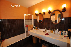 La baignoire a fait place à une spacieuse douche à l'italienne, un meuble avec double vasque en verre moulé confère modernité et élégance. Les toilettes ont été rénovées dans le même esprit design noir et blanc.